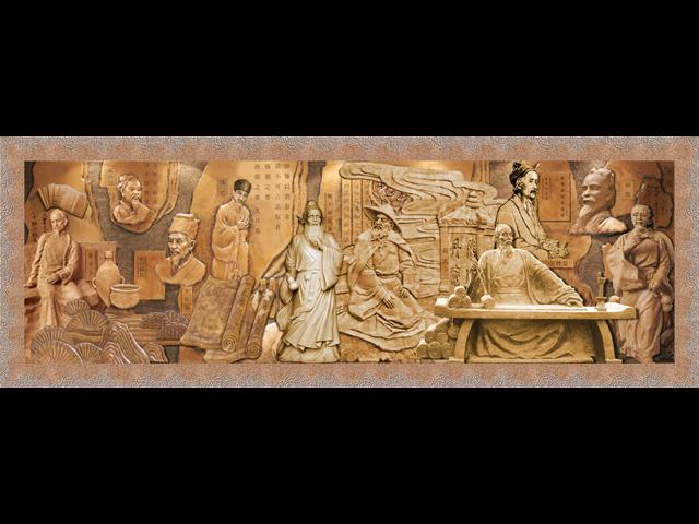 這個銅浮雕墻是為安徽金馬藥業(yè)設(shè)計(jì)的大門墻壁裝飾浮雕設(shè)計(jì)方案。以我國歷史上著名的醫(yī)者人物為主要雕刻對象,配以古文字、圖案、書卷等古代物品突出了醫(yī)藥的主題并彰顯了公司的歷史文化和傳統(tǒng)。