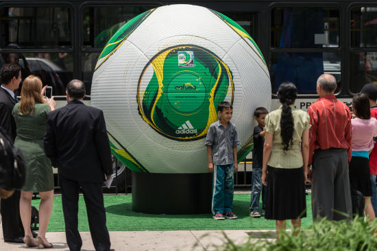 北京時間12月4日,2013年巴西聯合會杯用球CAFUSA雕塑亮相巴西圣保羅街頭。巴西市民紛紛與之合影留念。圖為兒童與雕像合影。